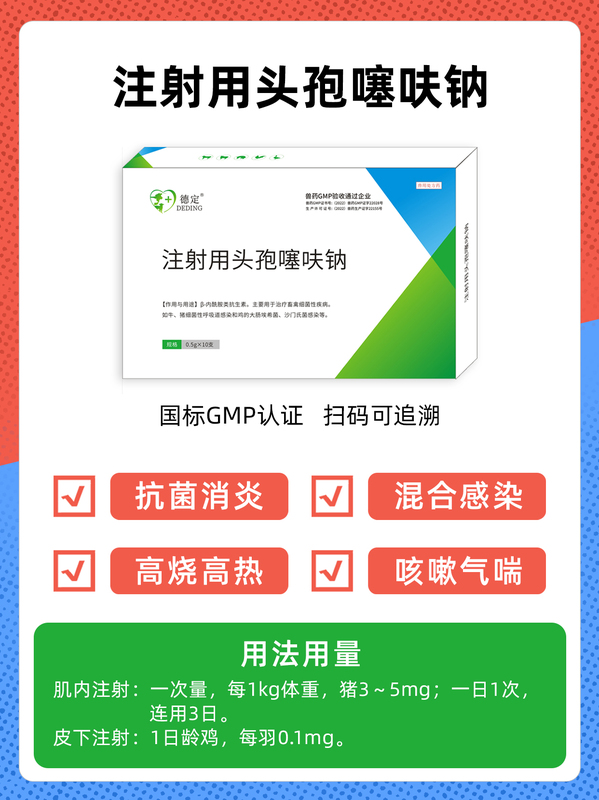 【用法与用量】以头孢噻呋计。肌内注射:一次量,每1kg体重,猪3~5mg;一日1次,连用3日。皮下注射:1日龄鸡,每羽0.1mg。