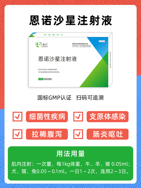 【药理作用】药效学 恩诺沙星属氟喹诺酮类动物专用的广谱杀菌药。对大肠埃希菌、沙门氏菌、克雷伯氏菌、布鲁氏菌、巴氏杆菌、胸膜肺炎放线杆菌、丹毒杆菌、变形杆菌、黏质沙雷氏菌、化脓性棒状杆菌、败血波特氏菌、金黄色葡萄球菌、支原体、衣原体等均有良好作用,对铜绿假单胞菌和链球菌的作用较弱,对厌氧菌作用微弱。对敏感菌有明显的抗菌后效应。本品的抗菌作用机制是抑制细菌DNA旋转酶,干扰细菌DNA的复制、转录和修复重组,细菌不能正常生长繁殖而死亡。