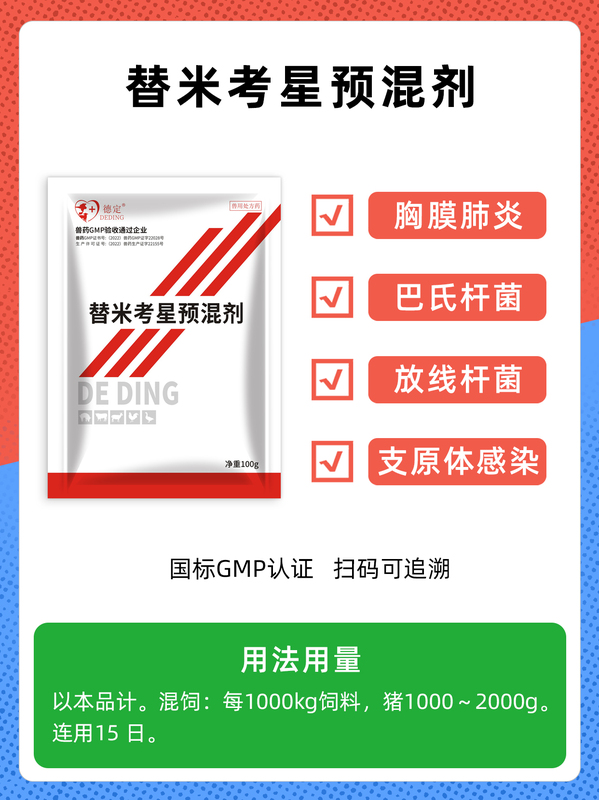 【兽药名称】通用名称:替米考星预混剂